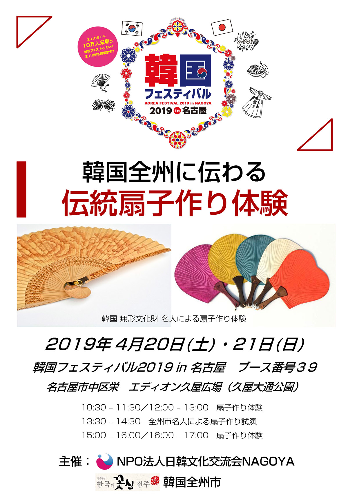 私達、NPO法人日韓文化交流会NAGOYAは、韓国の全州市に伝わる伝統扇子が作れる体験ブース(39番)を出展させていただきます。