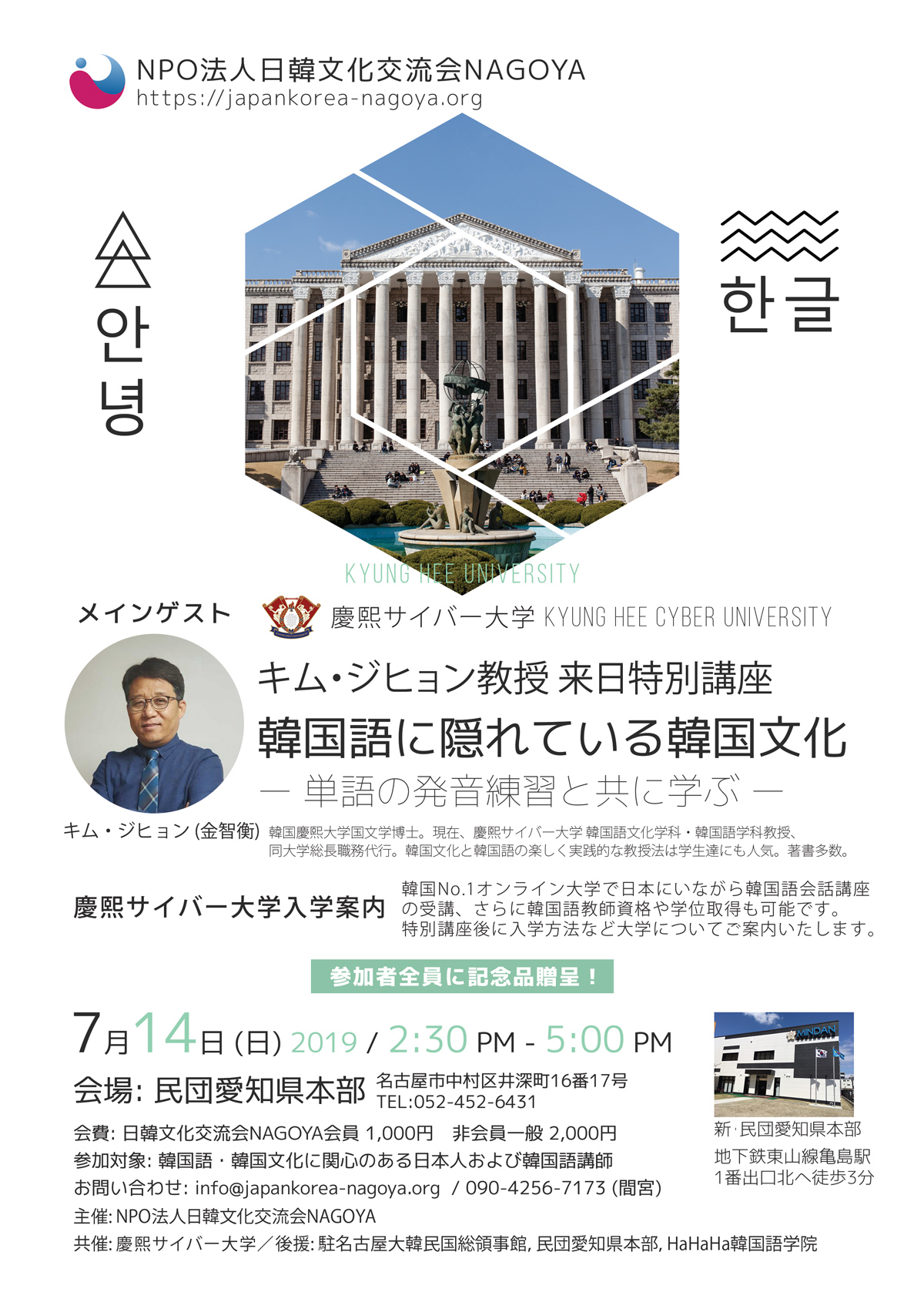 日韓文化交流会NAGOYAで毎年恒例の韓国語特別講座が行われます。今回は発音教育論の専門の教授を迎えて講座をすることになりました。